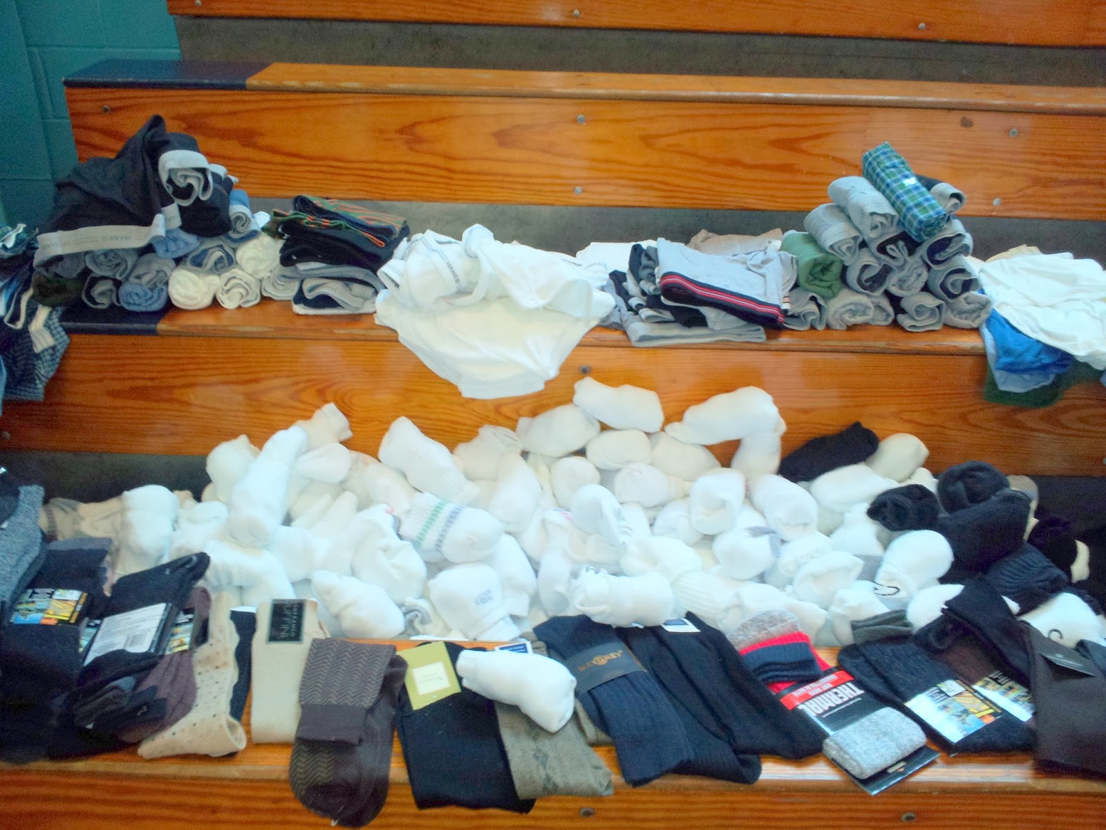 Socks (all sizes), new underwear (men and womens- all sizes), and table decorations.